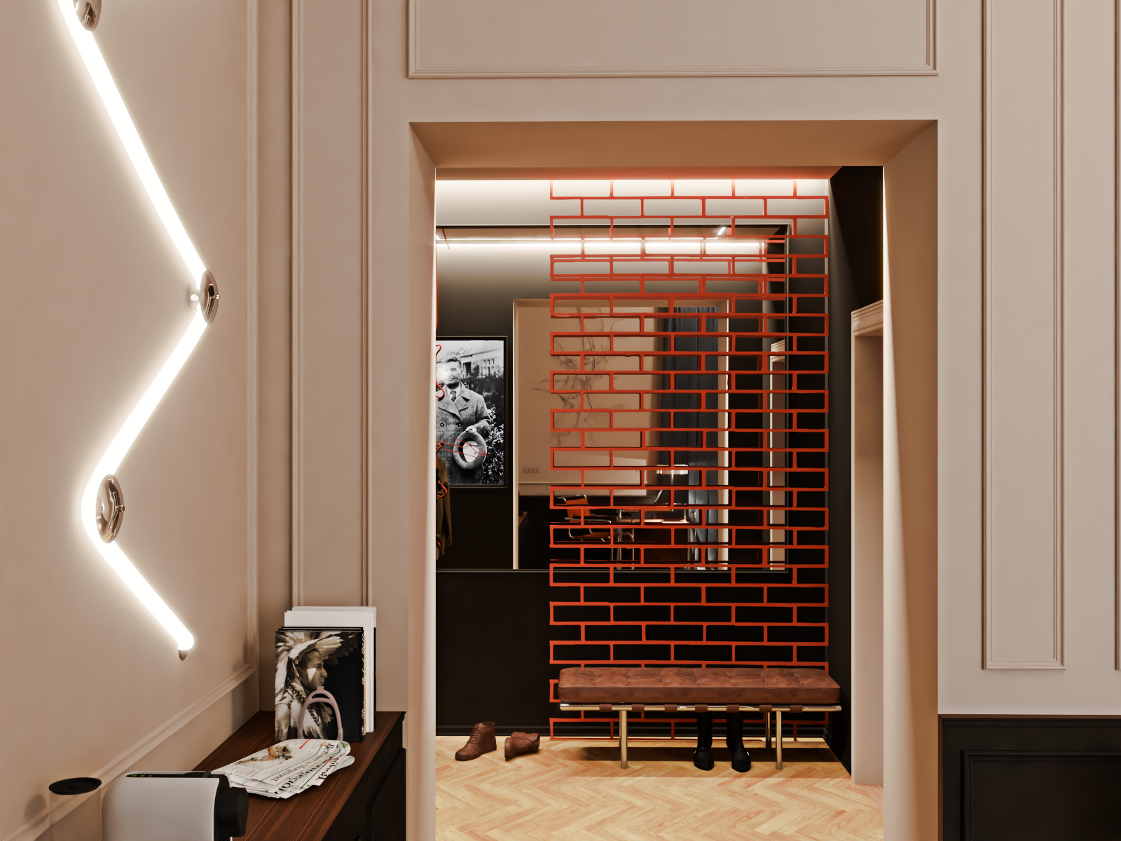 S Baťou jsem nalezla prolnutí právě v podobně kazetových a lištových dekorací a tvaru vycházející z vily Tomáše Bati. Přejala jsem i křivkový vzhled pro nábytek vycházející jak z výrobků a loga Bati, tak z opulentnosti Puppu. Puppovské béžové barevnosti jsem dodala kontrastní antracitový vzhled na spodních kazetách a v detailech odkazující na industriální téma a proces Baťovy výroby. Pro typický Baťův výrobek - botu a interiér je v interiéru symbolická kombinace kůže, chromu a skla, následovanou cihlou a její barevností. Unikátní Zlínská architektura se nakonec stala signifikantním příběhem, který je protkán celým apartmánem.