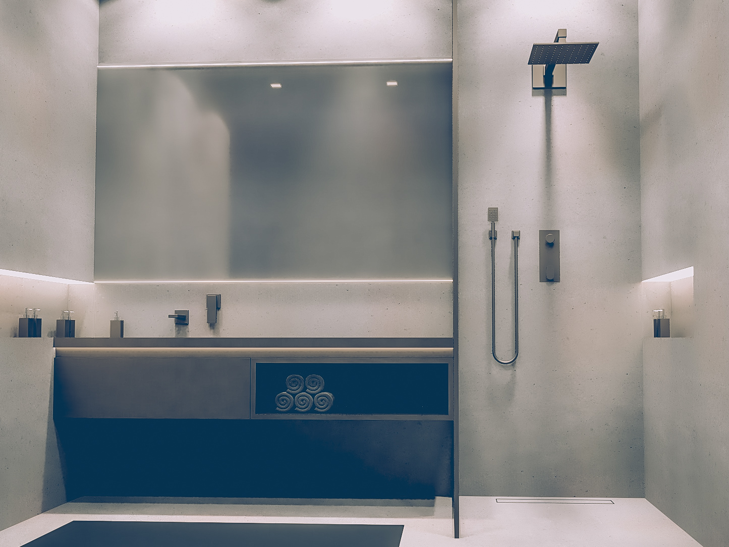 Moderní pánská koupelna s betonovým povrchem doplněna o šedočerné doplňky. Vše je navrženo v tvrdých pánských hranách a je doplněno o zabudované pásy (poličky) ve zdech v tentýž stylu, vytvářející lem kolem celé koupelny. Koupelnu doplňují všudepřítomné chytré led světla a vytvářejí tak přizpůsobivou atmosféru.